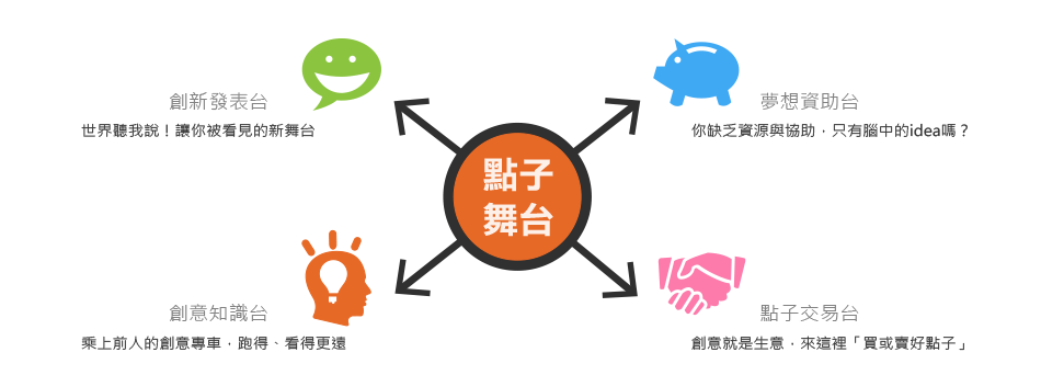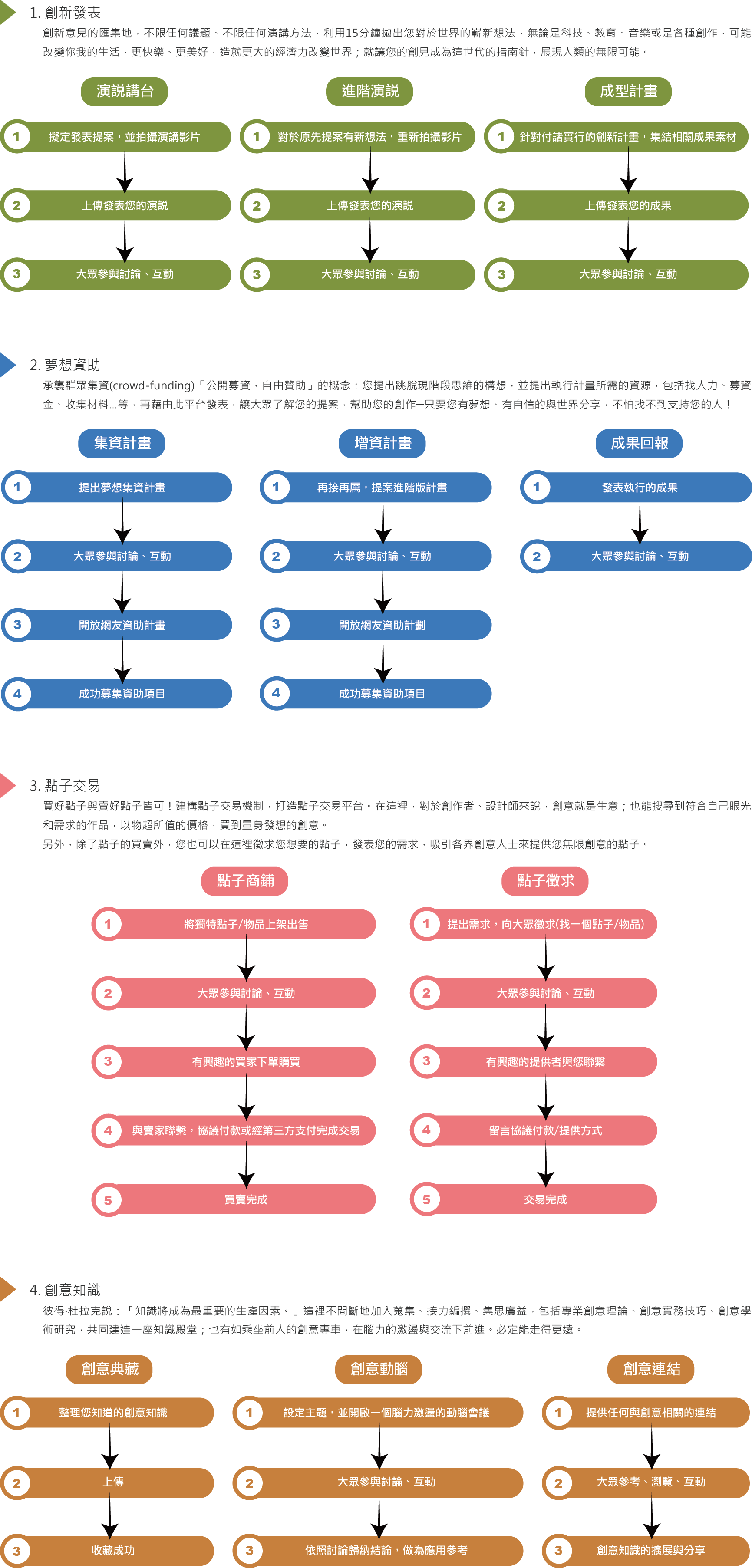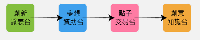 | 創新意見的講台,提出對特定主題的觀點、研究、創作… | 資助夢想實現的平台,集結眾人資源,讓您實現夢想不孤獨… | 創意作品交易,買別人的好點子,賣自己的好點子… | 創意知識資料庫,發揮集體智慧… |