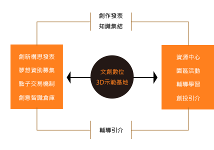 網路平台上的創意作品或提案,將擇優至園區做進階輔導及執行,得到創投廠商、專業團隊的實質協助。期望發掘有價值的創見,不僅能夠讓創作者發聲,也可能造就更大經濟力;相對的,園區所進行的輔導、研發成果,也將集結建構於此平台中,猶如一個專業與創意匯流的中介、學習與交流的中心。